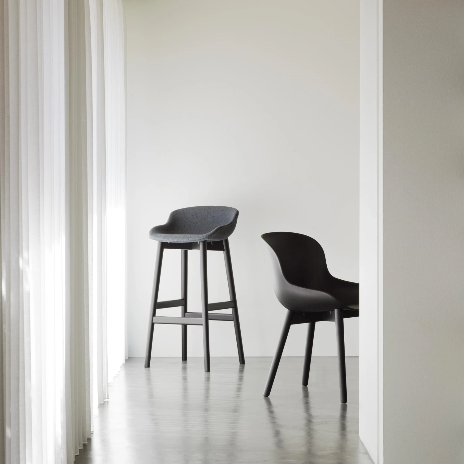 The Hyg series consists of a bar stool in several heights, a dining table chair, a swivel chair and an office chair. All are available in a wide range of configurations with different qualities and upholstery, which can be used together exactly as you want in your home, to create the perfect cosiness.